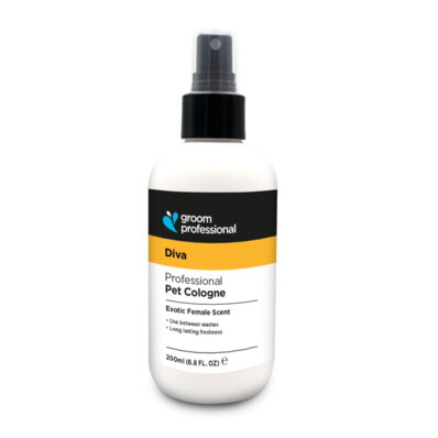 Groom Professional Diva Cologne - to odświeżający zapach przeznaczony dla suczek, skomponowany z esencji owoców egzotycznych, jaśminu i piżma. Nadaje szacie niepowtarzalny zapach i blask jednocześnie ją odświeżając. Bezpieczna dla skóry i sierści. Do częstego stosowania. Posiada bardzo intensywny zapach, dzięki czemu jest bardzo wydajny.
