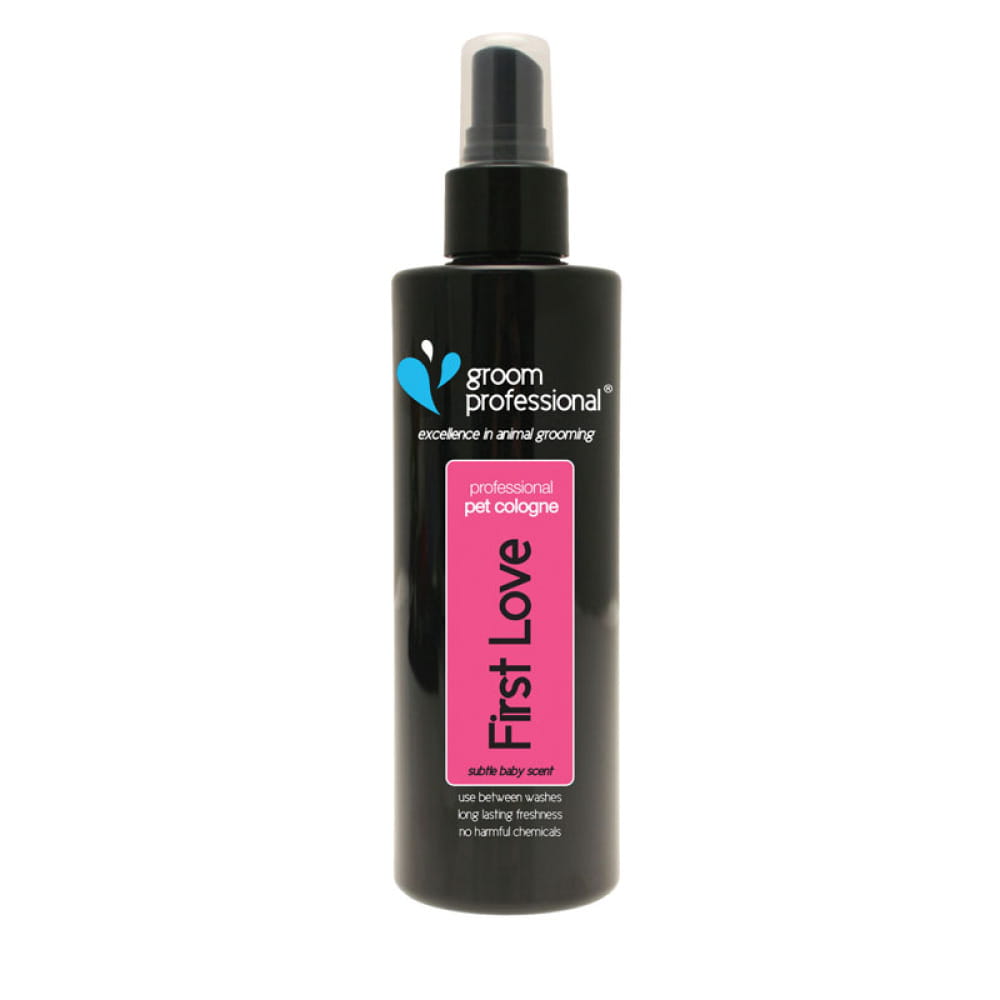 Groom Professional First Love Cologne - to odświeżający zapach przeznaczony dla suczek, zawierający kompozycję zapachową róży, głogu, drzewa sandałowego i piżma. Nadaje szacie niepowtarzalny zapach i blask jednocześnie ją odświeżając. Bezpieczna dla skóry i sierści. Do częstego stosowania. Posiada bardzo intensywny zapach, dzięki czemu jest bardzo wydajny.
