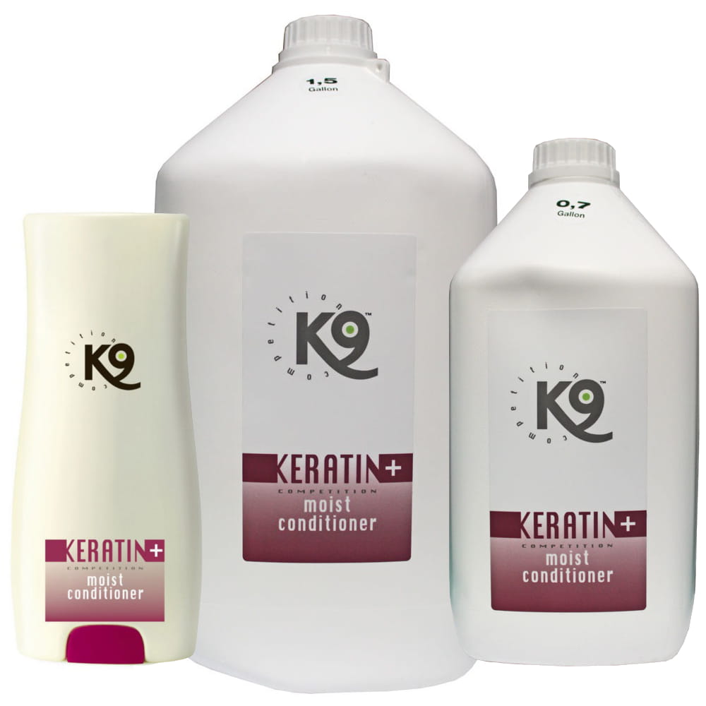 K9 Keratin+ Moist Conditioner to intensywnie nawilżająca i przywracająca włosom blask odżywka. W składzie zawiera białka keratyny i D-panthenolu, które sprawią, że szata będzie bardzo odżywiona i jedwabista z niesamowitym blaskiem. Idealna dla wszystkich rodzajów włosów. Leczy uszkodzone łodygi włosa, zwiększa jego siłę i elastyczność. Redukuje czas suszenia. Można rozcieńczać 1:40