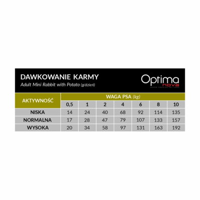 Karma Optimanova Adult Mini Digestive Rabbit with Potato wspiera prawidłowe funkcjonowanie organizmu, utrzymanie kondycji i zdrowia, a także odpowiada na potrzeby psów wymagających wysokiej jakości żywienia. Zalety produktu: formuła wspierająca trawienie - wysoka przyswajalność składników odżywczych pozwala na maksymalne wchłanianie, zapewniając pełne wykorzystanie wartości odżywczych oraz stymulując zdrowie jelit działanie antynowotworowe - selen jako antyutleniacz działa przeciwnowotworowo, przyczynia się do rozwoju układu nerwowego - pobudza układ odpornościowy i układ krążenia program kontroli odporności - kwasy tłuszczowe EPA i DHA wspierają prawidłowe funkcjonowanie układu odpornościowego i stawów zdrowe zęby i dziąsła oraz świeży oddech – odpowiednio zbilansowany poziom błonnika pokarmowego w połączeniu z minerałami wspomaga mechaniczne oczyszczanie zębów, ograniczając odkładanie się płytki bakteryjnej i kamienia nazębnego ochrona gastryczna - odpowiedni dobór składników pokarmowych czyni karmę lekkostrawną dzięki czemu nie obciąża ona nadmiernie układu trawiennego i wydalniczego efekt prebiotyczny - dodatek składników o działaniu prebiotycznym (FOS, MOS, skrobia błonnikowa) stymuluje rozwój korzystnych bakterii trawiennych, co poprawia zdrowie jelit (efekt bifidus)