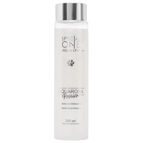 Szampon Aquarosa Passion rewitalizuje, głęboko odżywia i nawilża. Dodatkowo dzięki zawartym w nim mieniącym się drobinkom szata Twojego pupila będzie rozświetlona i pełna blasku. Produkt przeznaczony jest dla wszystkich psów i kotów. Warto jednak podkreślić, że efekt rozświetlenia będzie szczególnie spektakularny u ras z ciemnym włosem. Aquarosa Passion zawiera liczne witaminy i aminokwasy, które sprawiają, że szata stanie się zdrowa i niewiarygodnie miękka i gładka. Szampon polecany jest dla delikatnej i przesuszonej sierści, wymagającej rewitalizacji. Produkt łagodnie czyści nie naruszając tym samym warstwy hydrolipidowej i pH skóry czworonoga. Special One Aquarosa Passion ma przyjemny zapach, który podobnie jak efekt opalizującej perły utrzyma się na szacie przez dłuższy czas. Przeznaczony jest zarówno do użytku profesjonalnego jak i domowego.