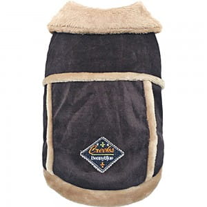 Ciepły, rozpinany kożuszek marki Dobaz, utrzymany w kolorystyce beżowo-kawowej, zapinany na trzy plastikowe napy. Od spodu podszyty został delikatnym materiałem typu "miś". Ubranko posiada ciepły kołnierz oraz ozdobne wykończenia, uszyte również z tego samego materiału. Materiał zewnętrzny to bawełna. Kurteczka niezwykle wygodna, nie krępuje ruchów pieska.Polecana na spacerki w chłodniejsze dni.